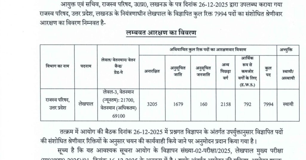 लेखपाल के कुल 7,994 रिक्त पदों का विवरण